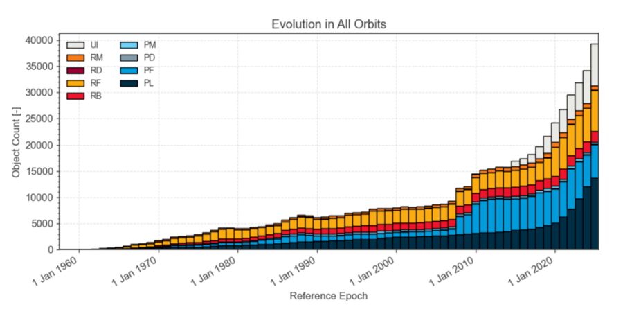 《2025年太空环境报告》显示,地球轨道上可追踪物体数量随时间变化图。图表来源:欧空局。