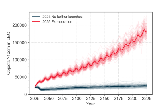 《2025年太空环境报告》针对未来地球轨道上发生灾难性碰撞的次数预测图。图表来源:欧空局。